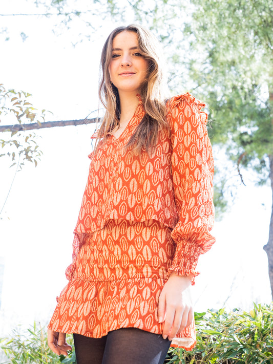 BLUT01 Blusa volante hombro hojas naranja quemado