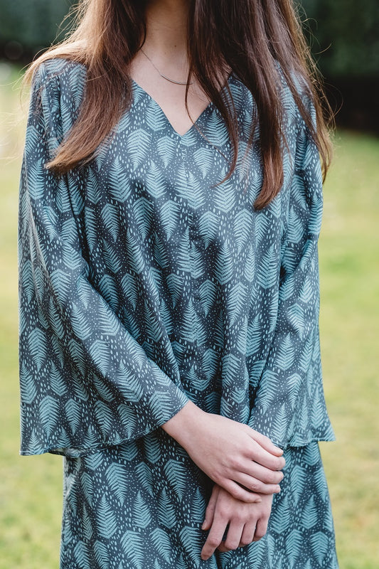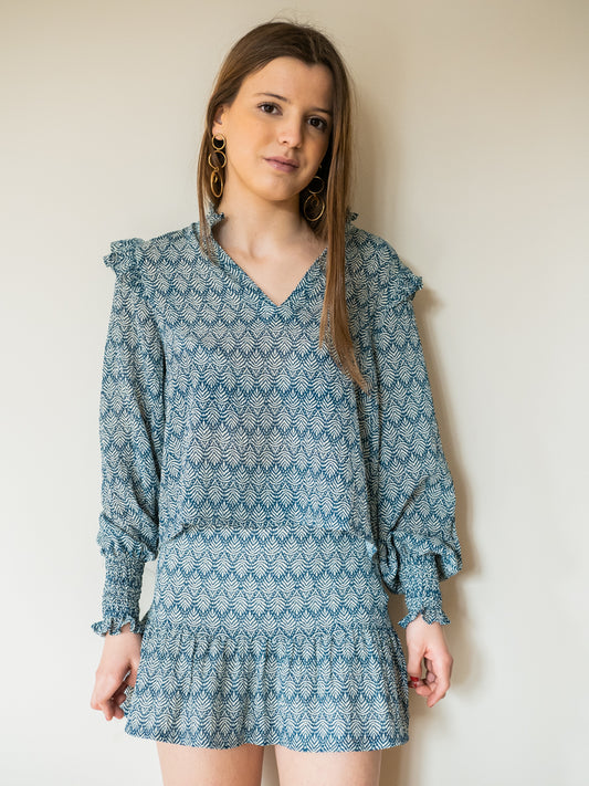 BLUT02 Blusa volante hombro hojas azul petróleo