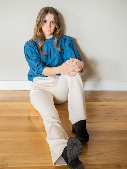 BLIUT06 Blusa cuello perkins encajes azul petróleo