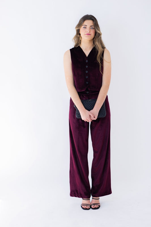 PANT10 Pantalón terciopelo brillo granate