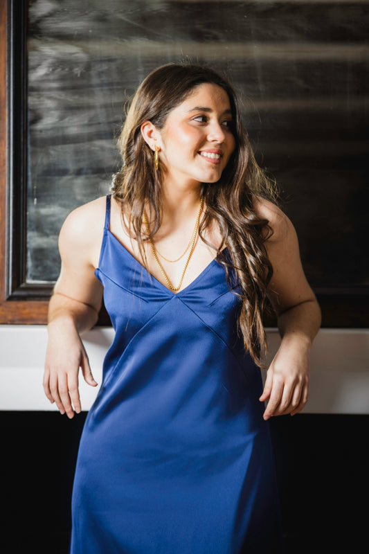 VEST04 Vestido largo satén azul noche