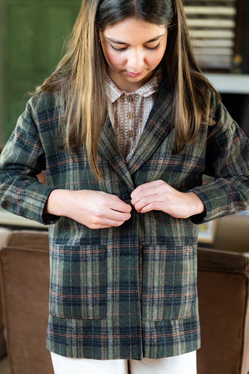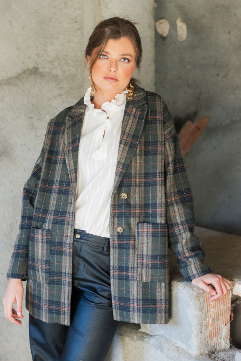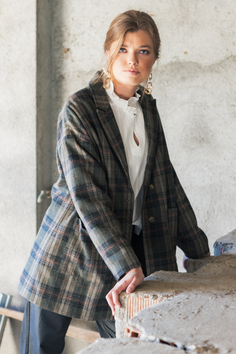 Abrigo oversize corto con solapas. Se abrocha con 2 botones. Detalle de bolsillos cuadrados.