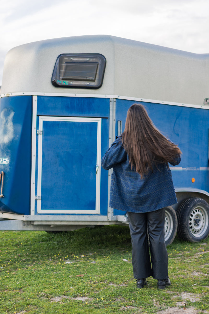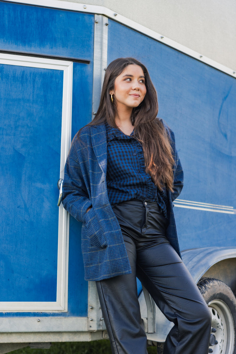 Abrigo oversize corto con solapas. Se abrocha con 2 botones. Detalle de bolsillos cuadrados.