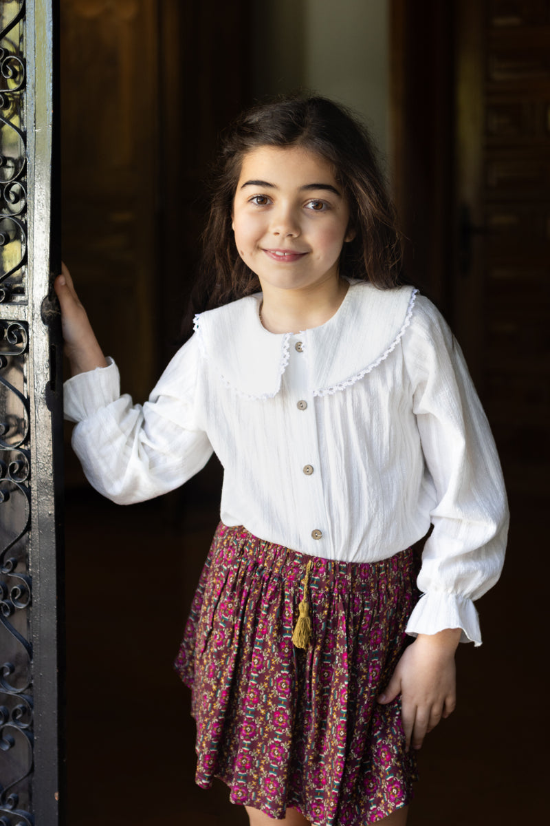 Una blusa blanca es un comodín para combinar con cualquiera de nuestras partes de abajo. Nosotros te recomendamos coordinarla con nuestros estampados de flor granate y vichy azul.