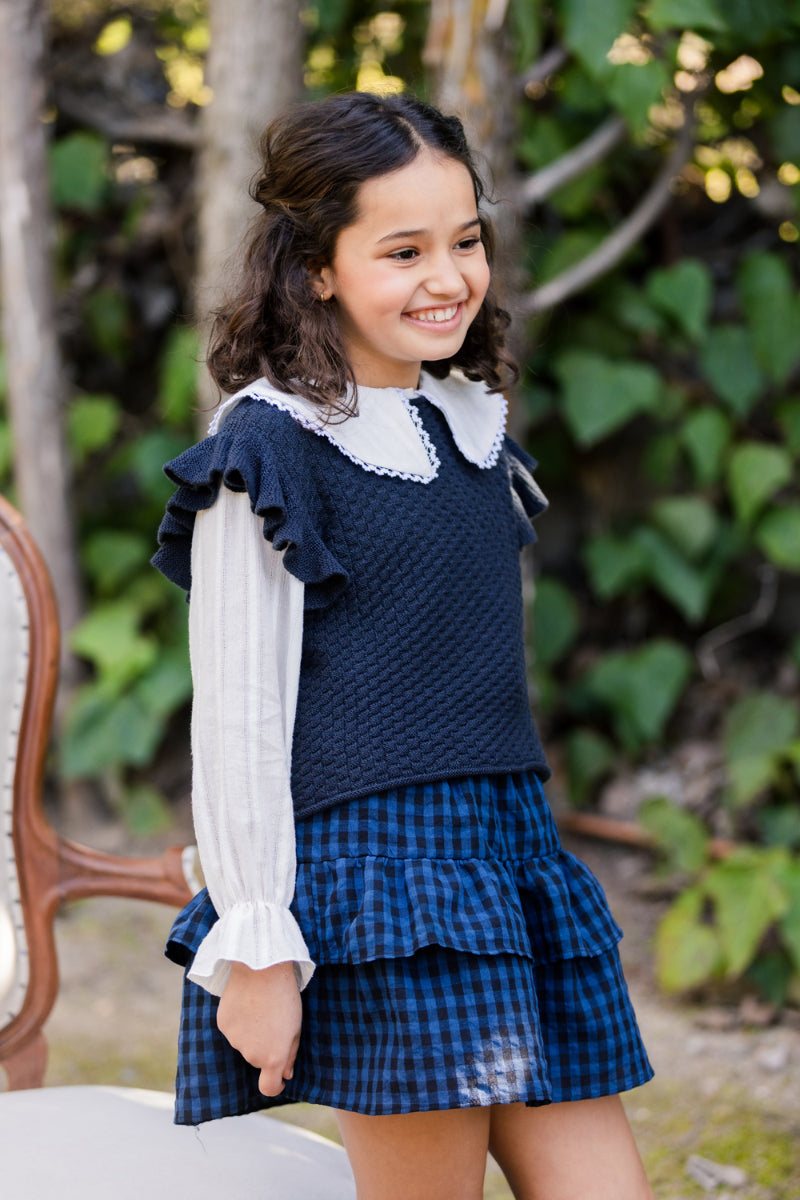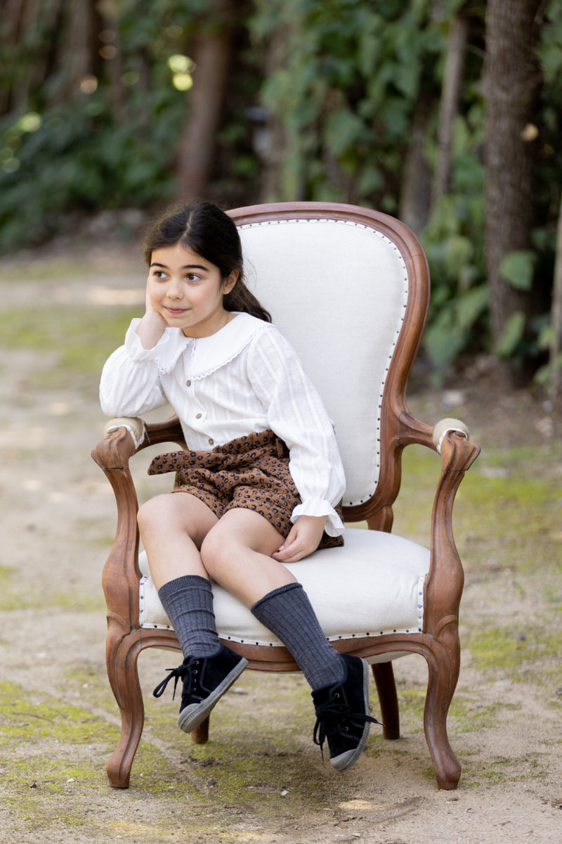 Blusa cuello bobo ribeteado con bolillo blanco. Cierre delantero con botones coco. Manga larga con puño elástico acabada en volante.