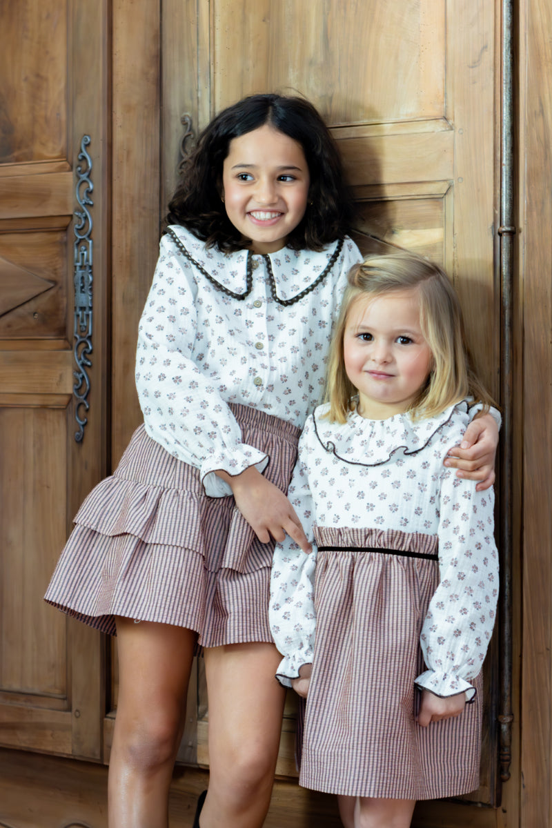 Blusa cuello bobo ribeteado con bolillo chocolate. Cierre delantero con botones coco. Manga larga con puño elástico acabada en volante.