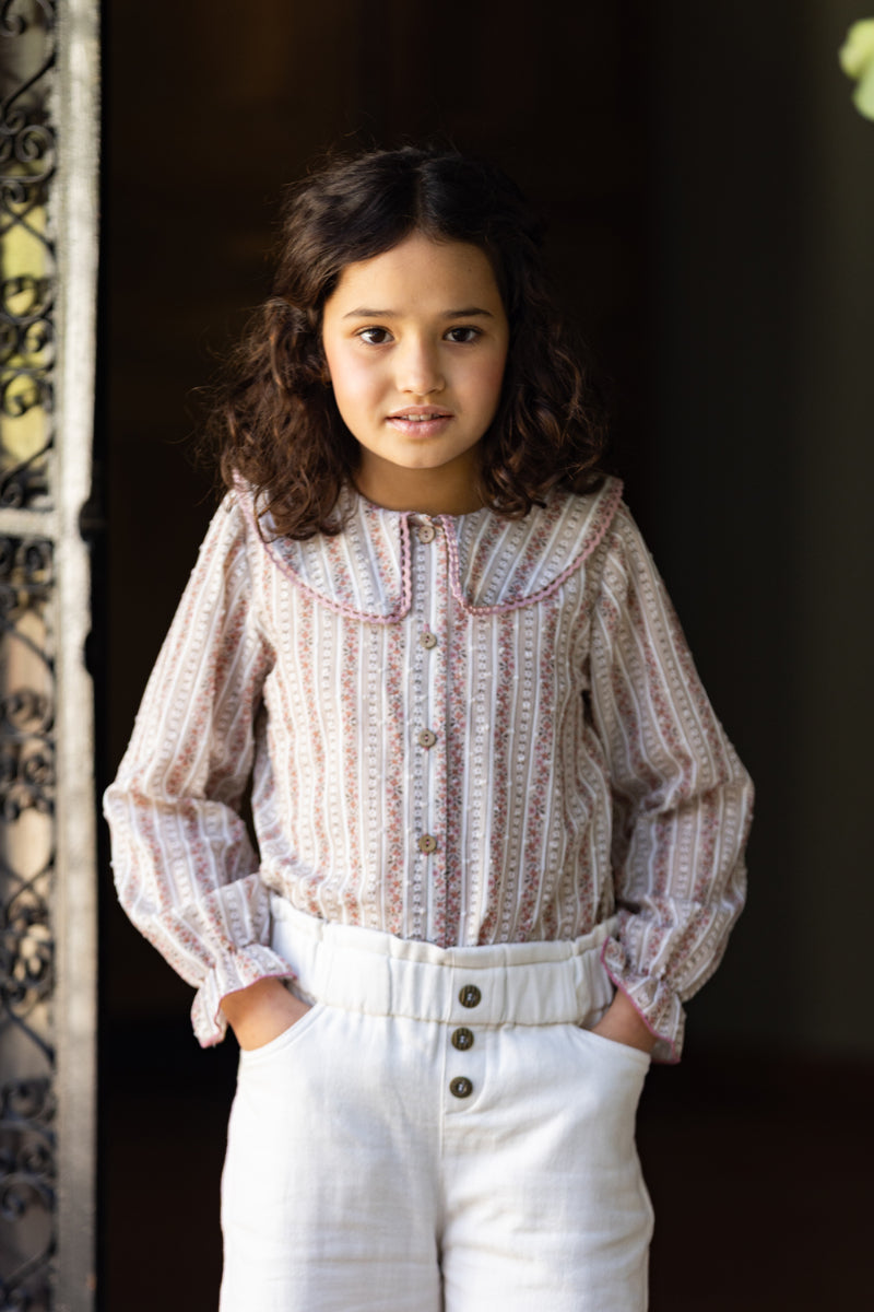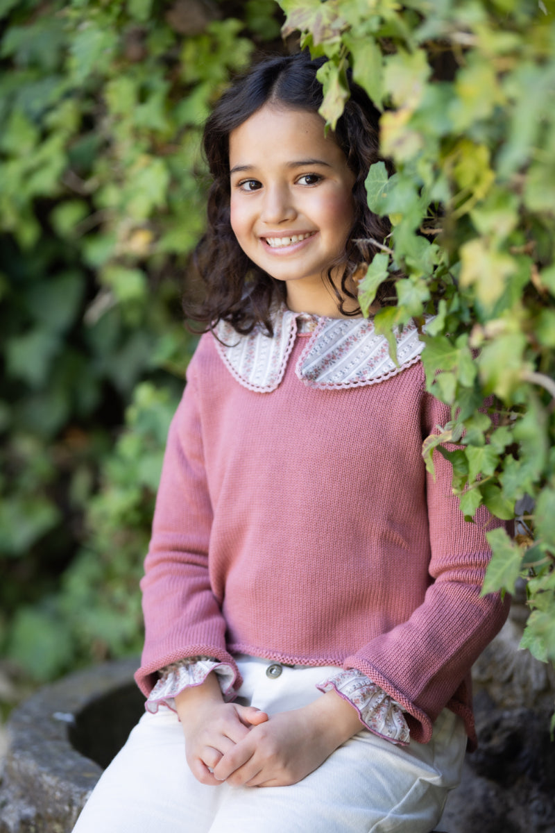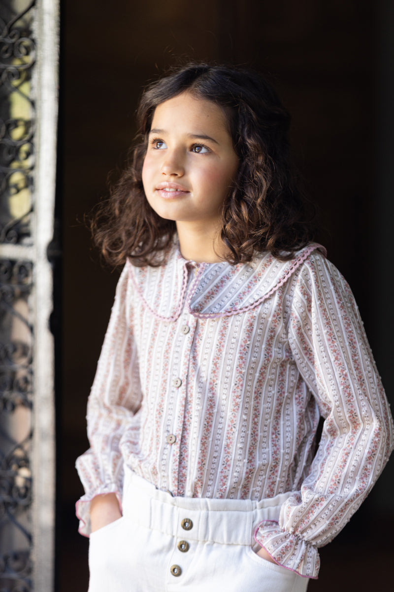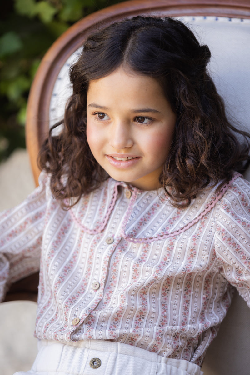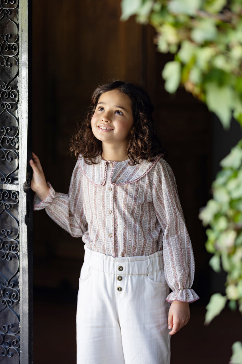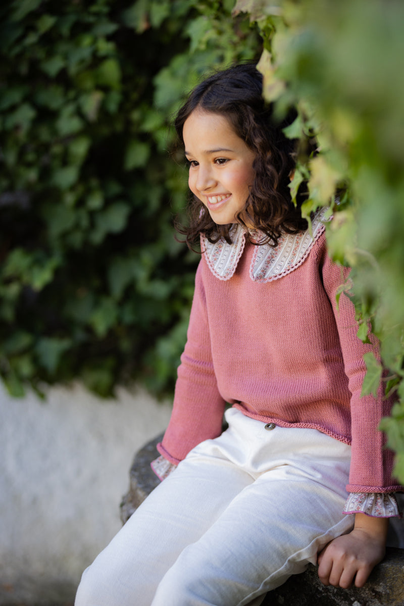 Blusa cuello bobo ribeteado con bolillo rosa. Cierre delantero con botones coco. Manga larga con puño elástico acabada en volante.