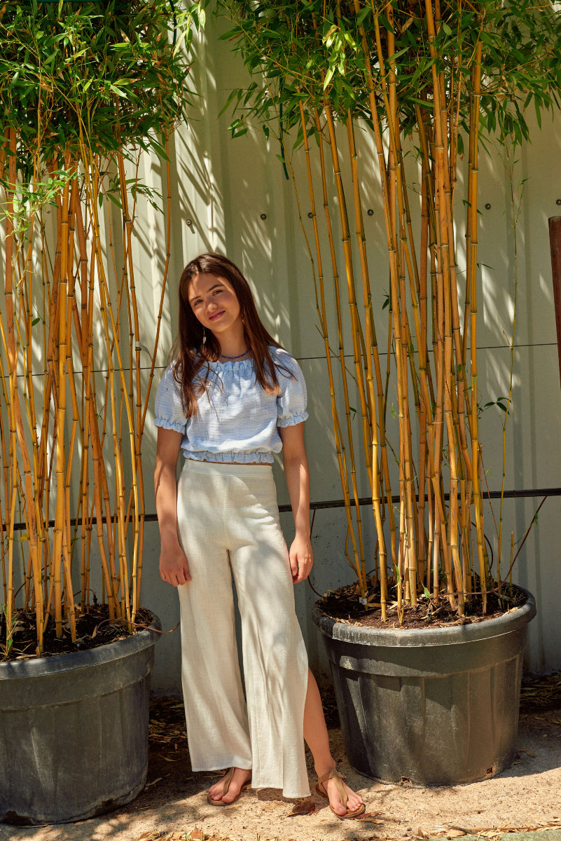 Blusa cuello redondo engomada, manga farol y goma en cintura.