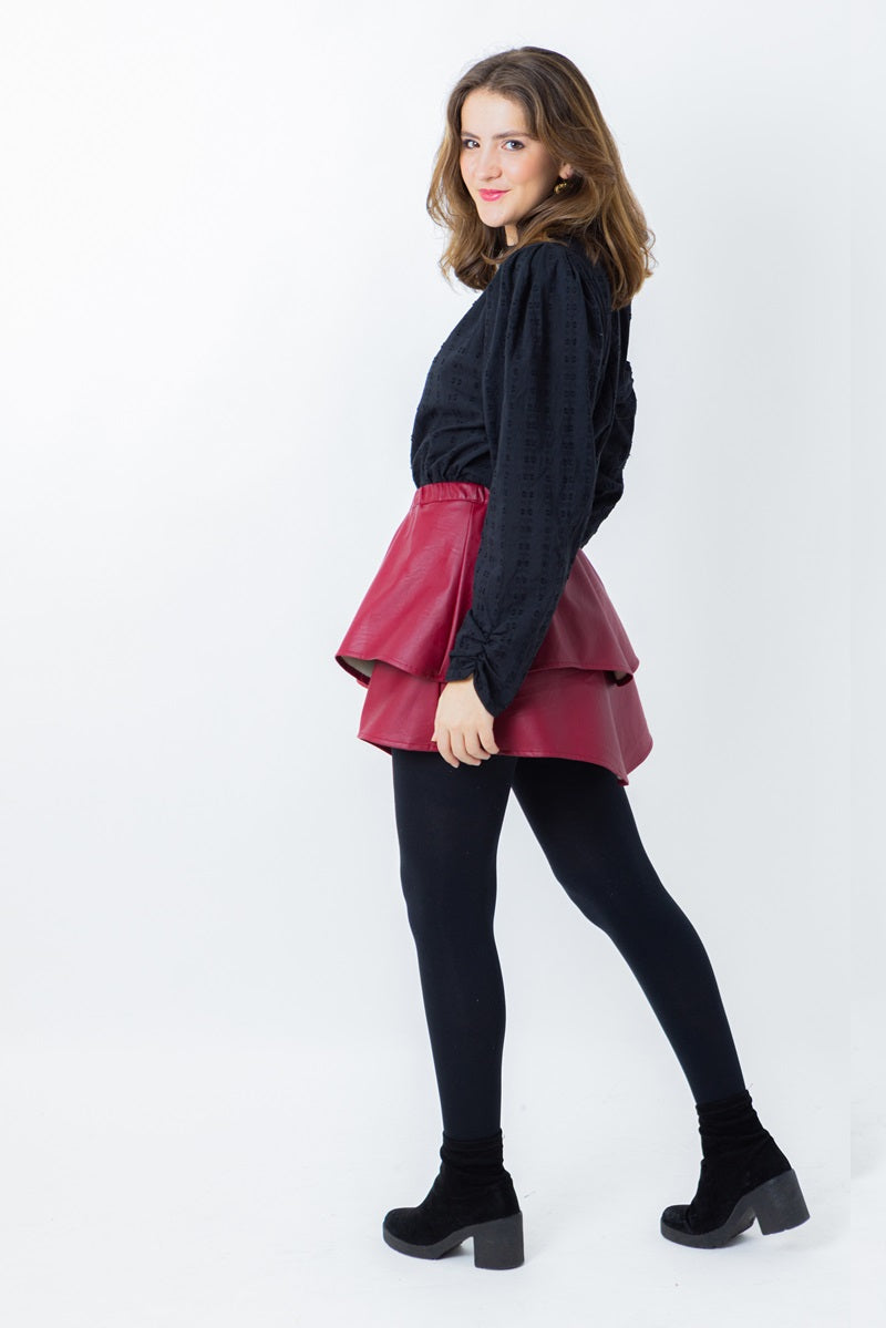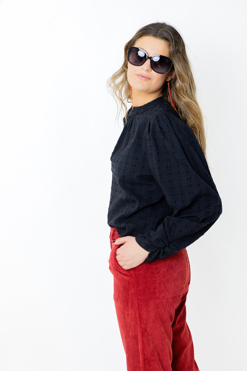 Blusa cuello perkins. Manga larga con frunce en el hombro y puño retenido.