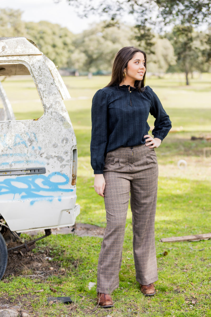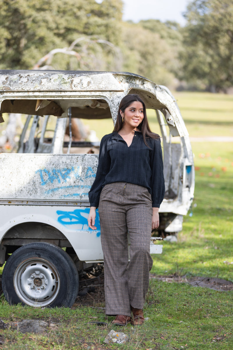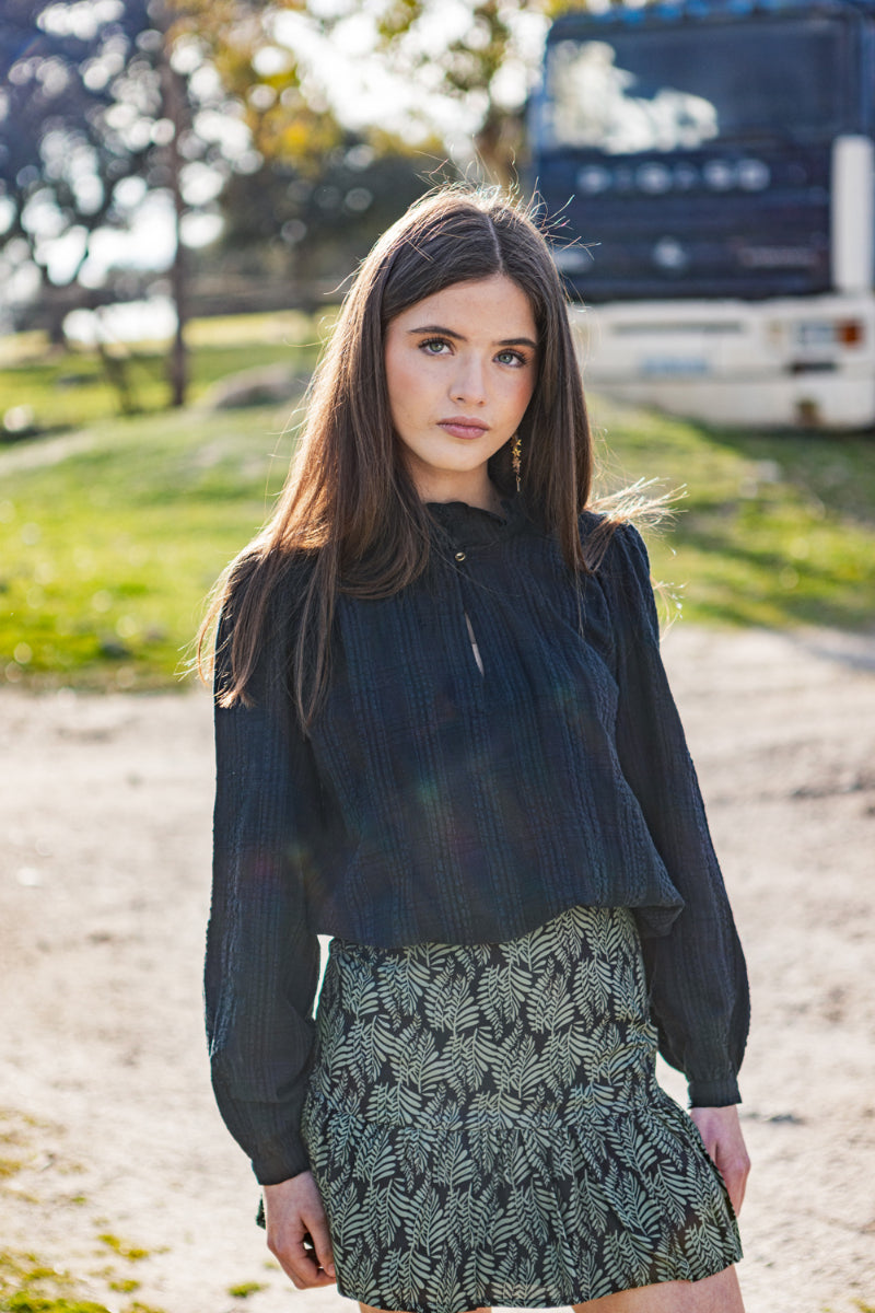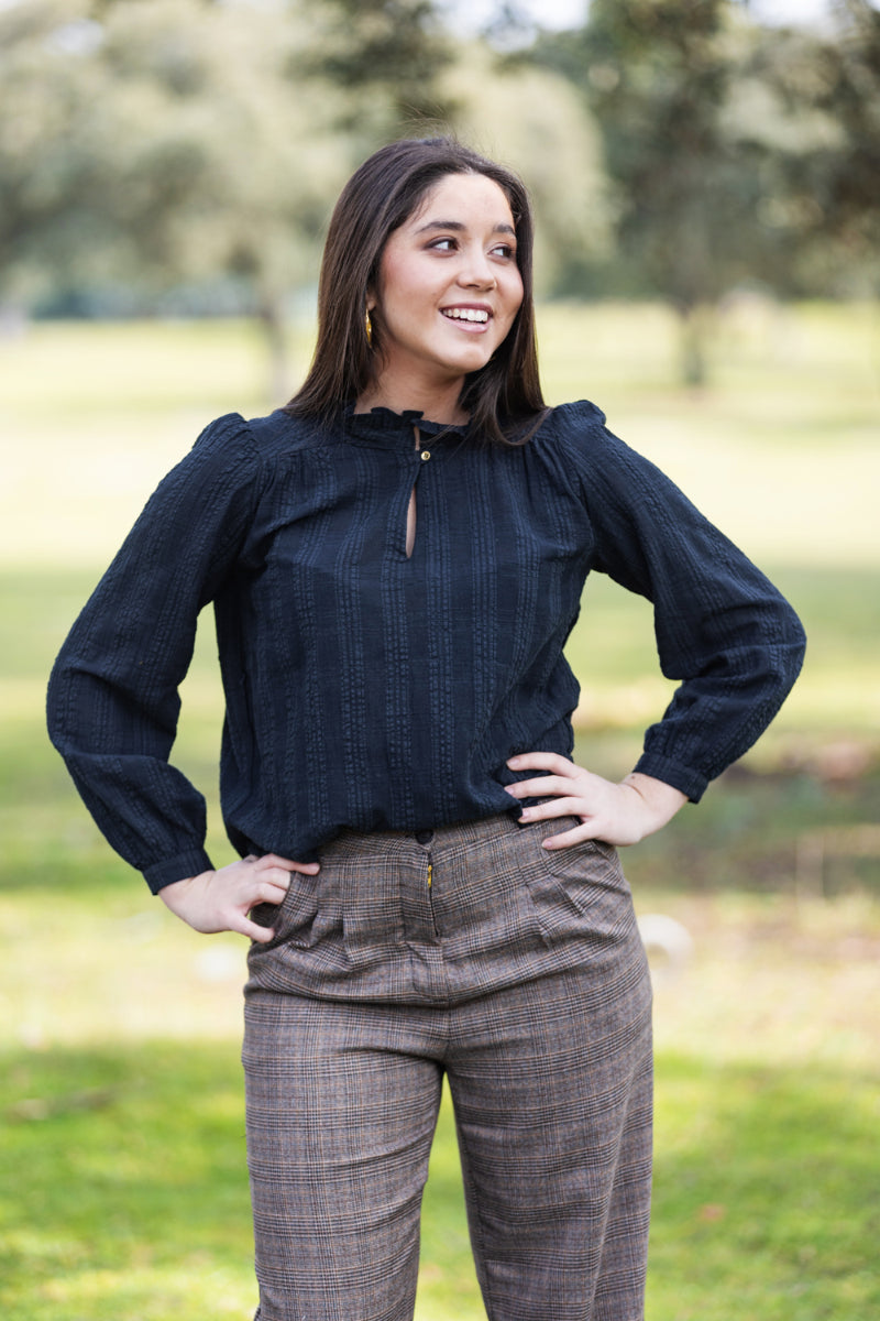 Combínala con nuestra falda corta hojas o nuestro pantalón cuadro marrón. También póntela con tus vaqueros preferidos. Conseguirás un outfit ideal para tu día a día.
