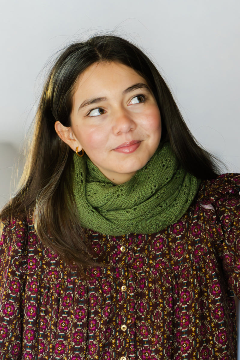 Punto con dibujo calado. Composición 100% algodón. Tacto súper suave, no pica. Color verde muy favorecedor.