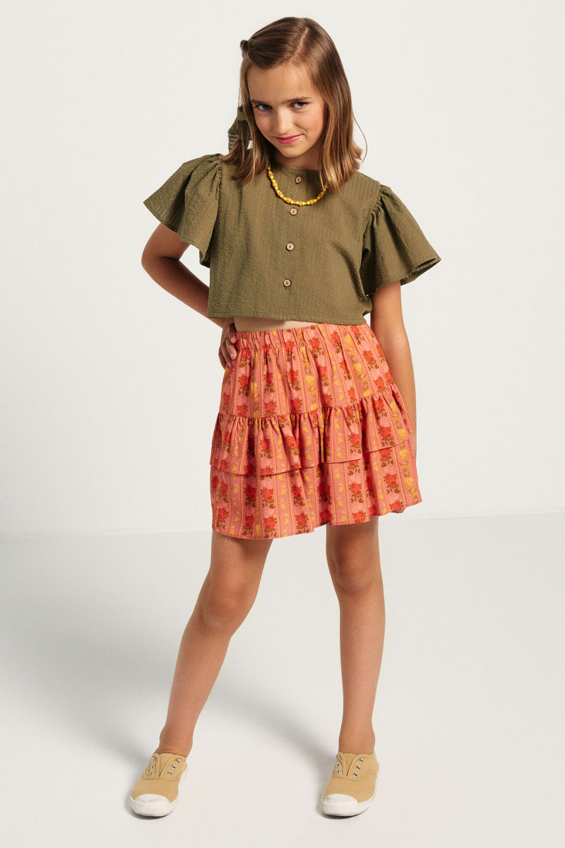 Nos encanta con nuestra blusa alitas o asimétrica volante en tono kaki. Para las noches más frescas combínala con nuestra parka kaki.