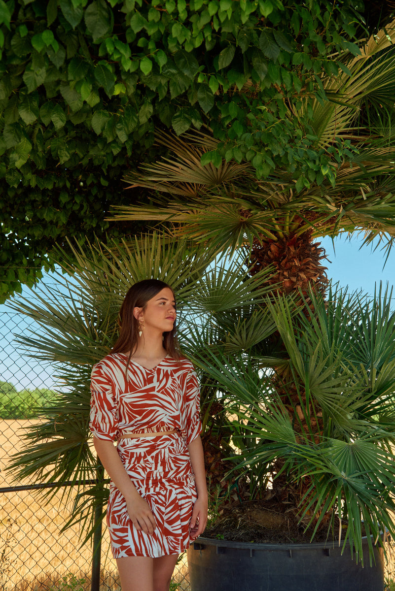 Te recomendamos combinarla con nuestras partes de arriba del mismo estampado o nuestros tops teja. Podrás realizar infinitas combinaciones.