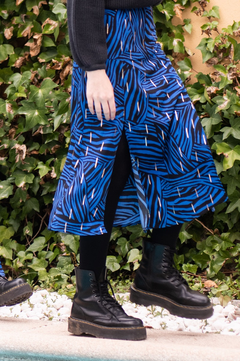 Estampado print tipo cebra azul noche y negro, con unos toques doradas que le dan un aire único y diferente.