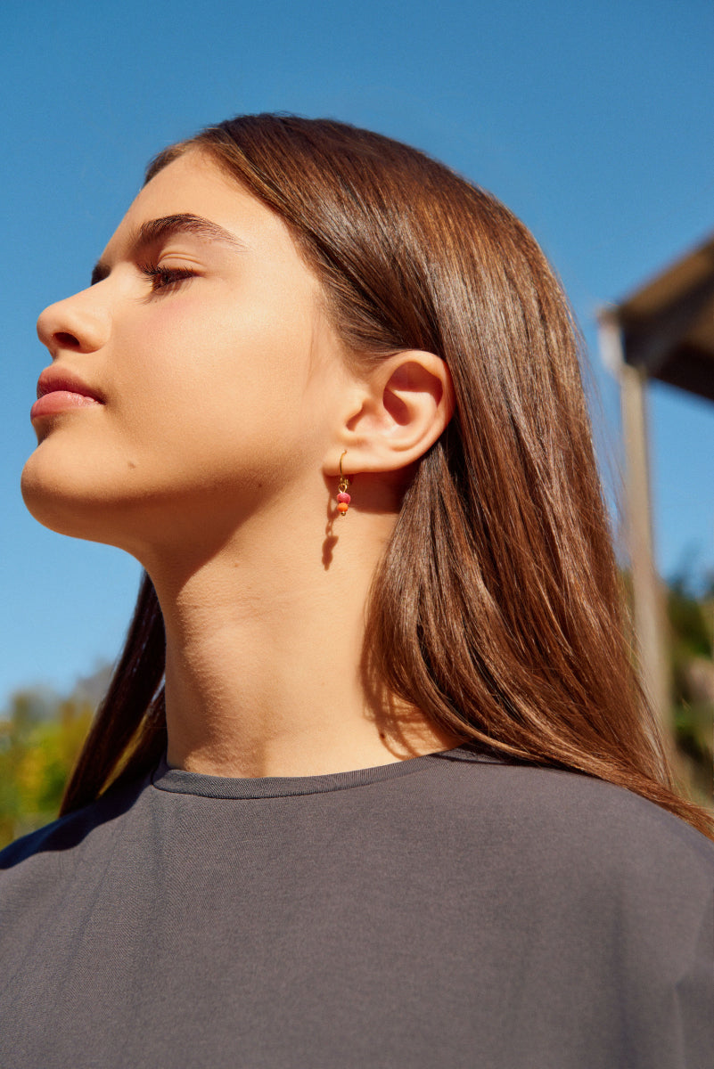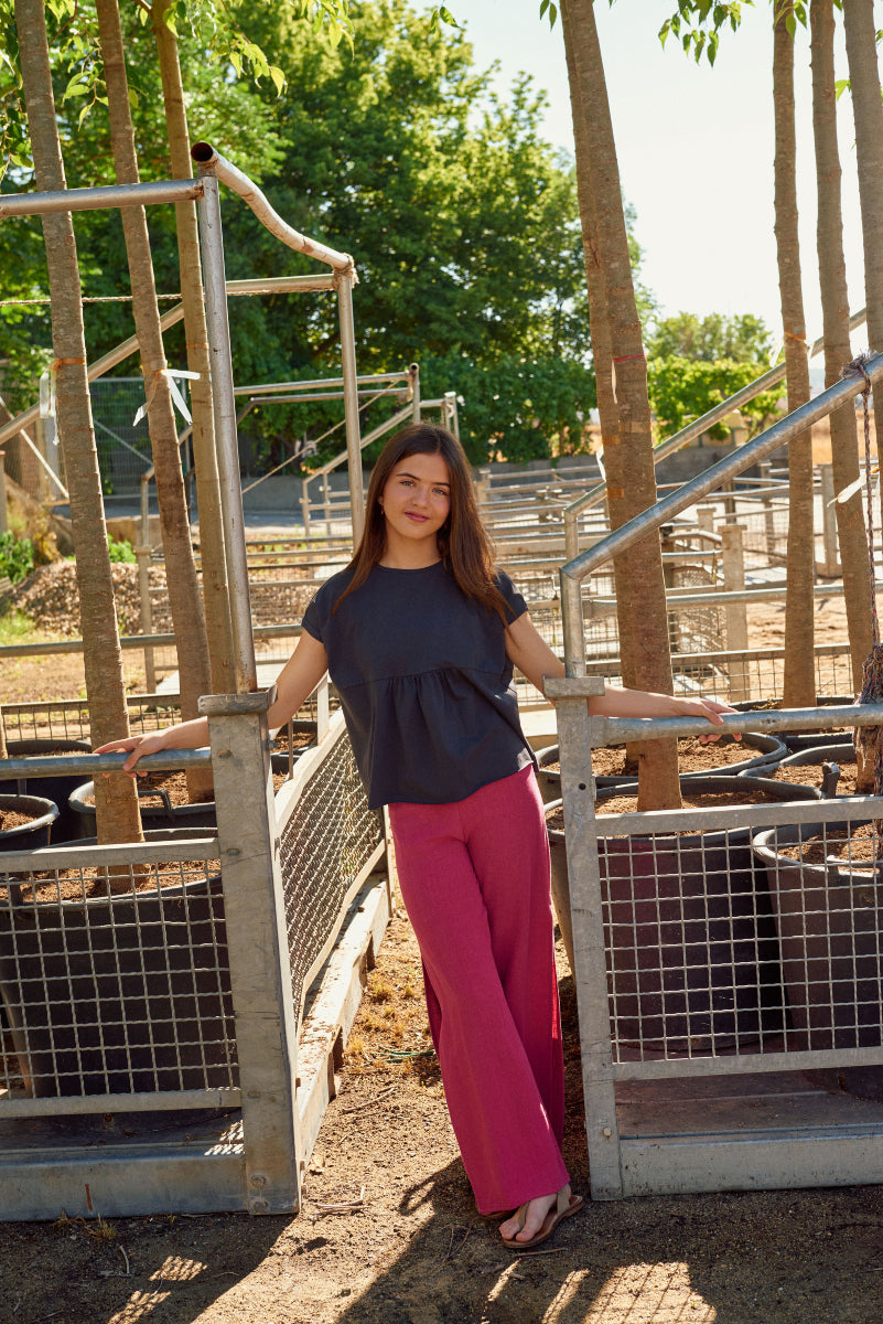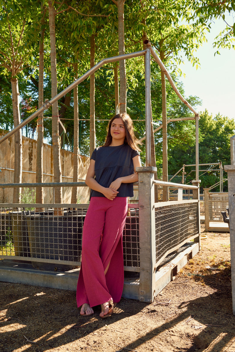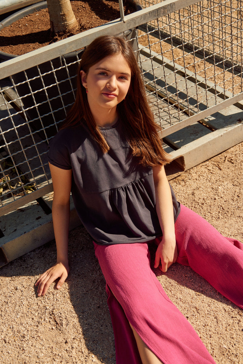 Camiseta ancha de cuello redondo, corte alto y cuerpo ligeramente fruncido.
