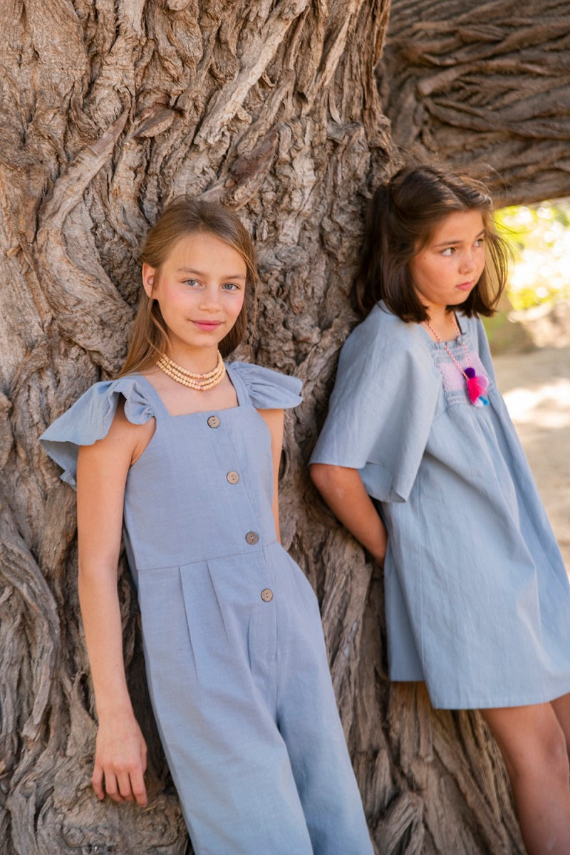 Mono escote cuadrado. Con tirantes acompañados por unos generosos volantes que acaban con una lazada trasera. Cierre con botones de coco en delantero.