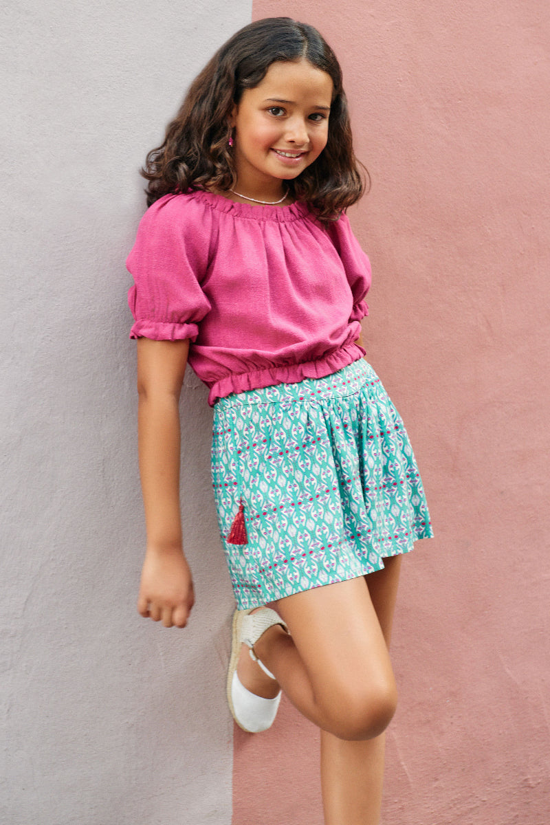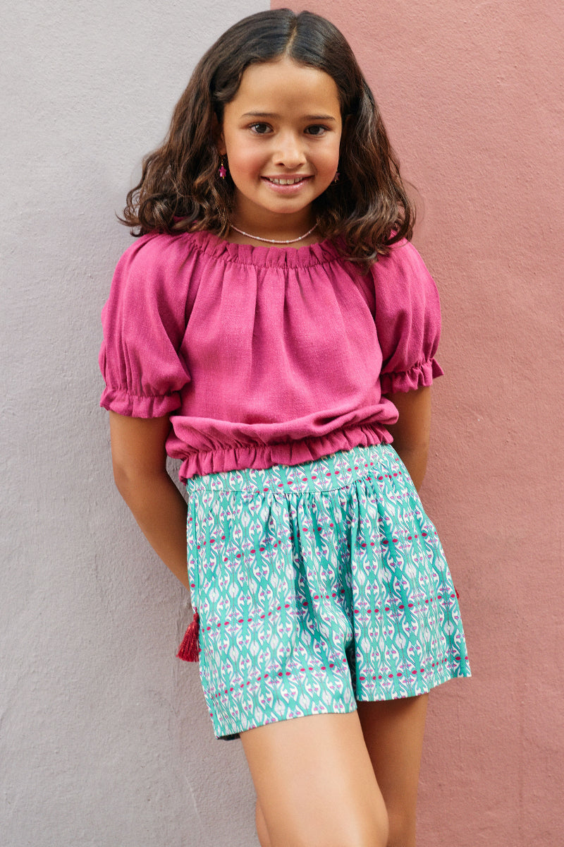 Pantalón corto con vuelo y bolsillos delanteros. Cintura elástica trasera. Detalle de borlas fresas en contraste.