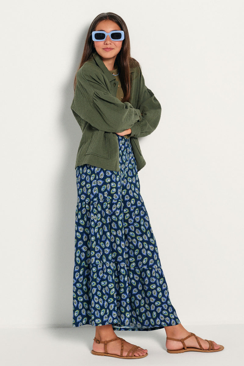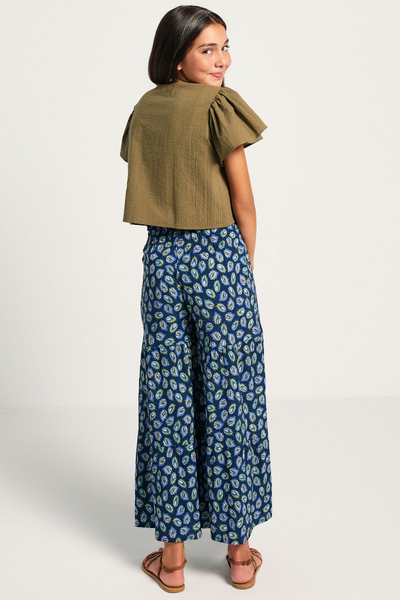 Tejido 100% viscosa. Estampado de plumas en tonos turquesa, kaki, marfil y azul.