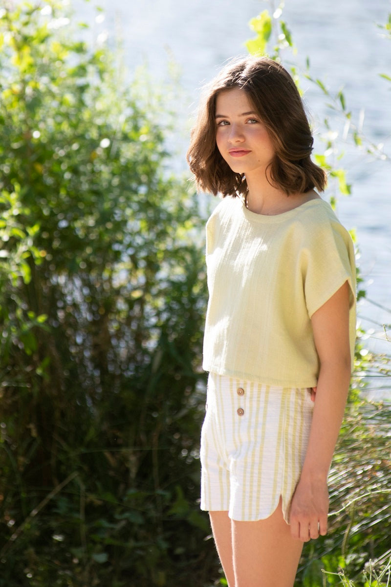 Tejido de rayas marineras en tono limonada, 90% algodón y 10% poliéster. Forrado.