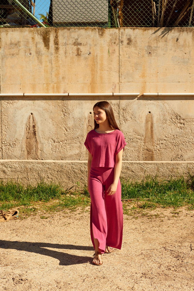 Tejido rústico suave 80% viscosa y 20% lino en un tono buganvilla muy favorecedor.