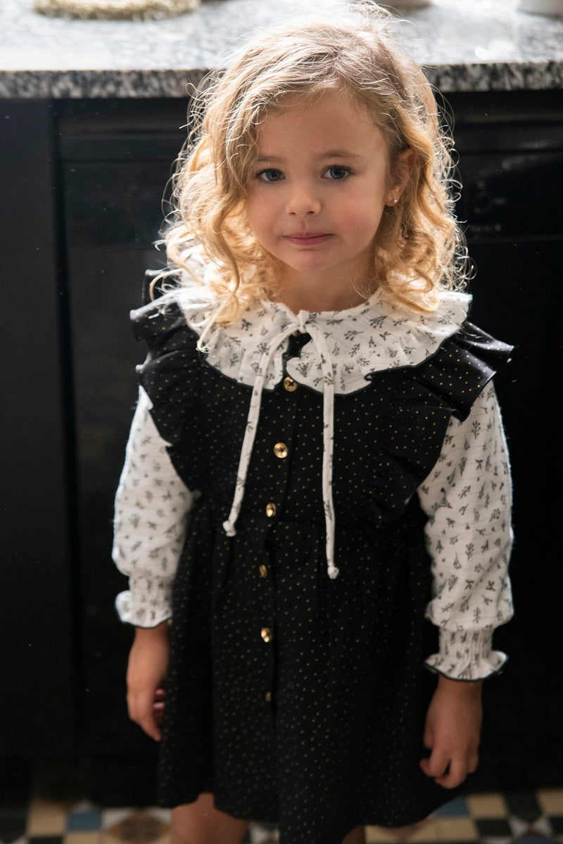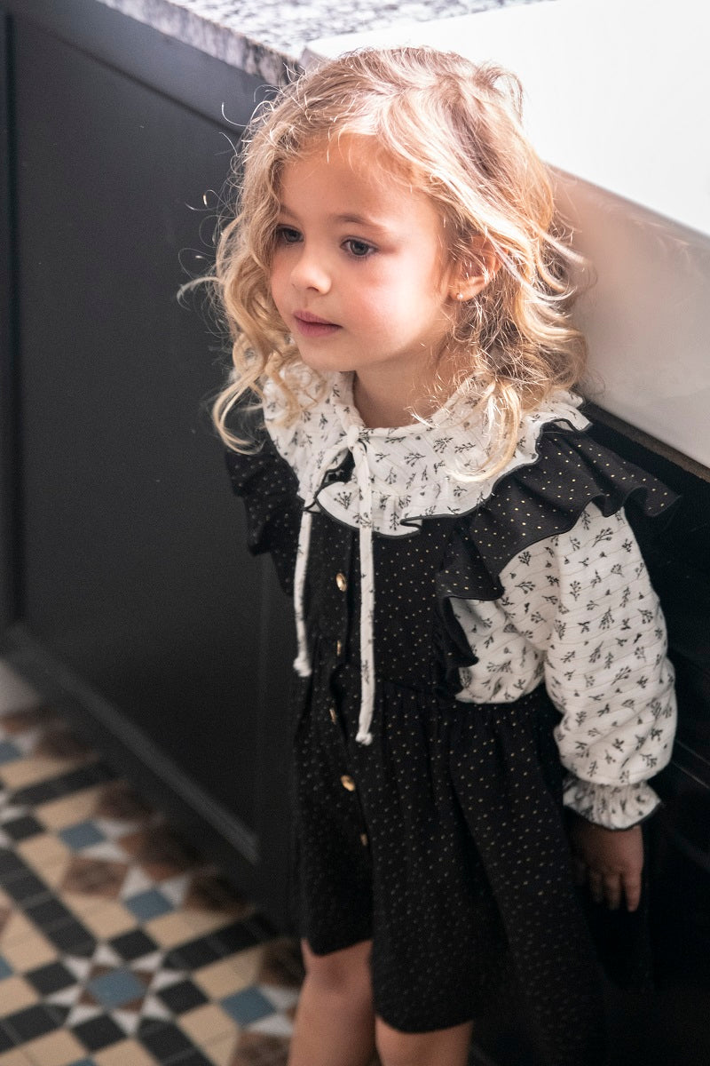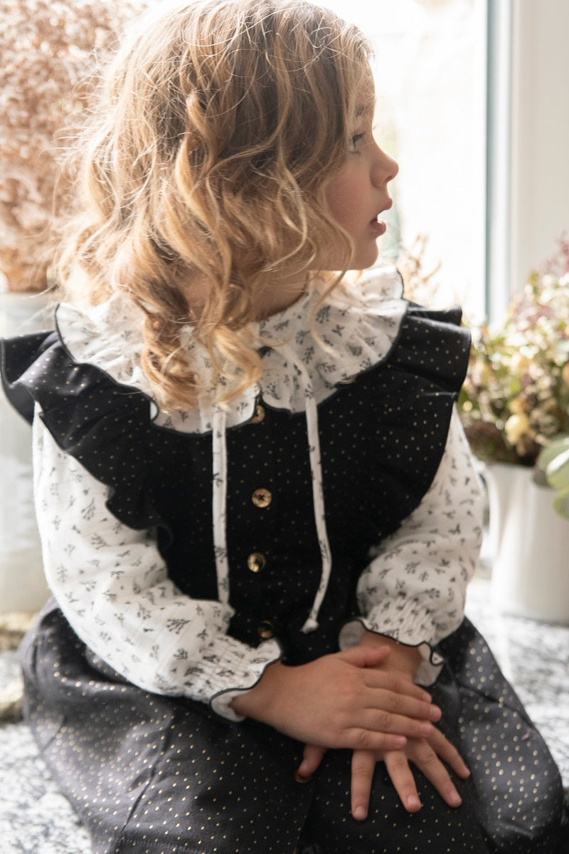 Tejido negro de tacto suave con topitos dorados 52% algodón y 48% viscosa. Forrado.