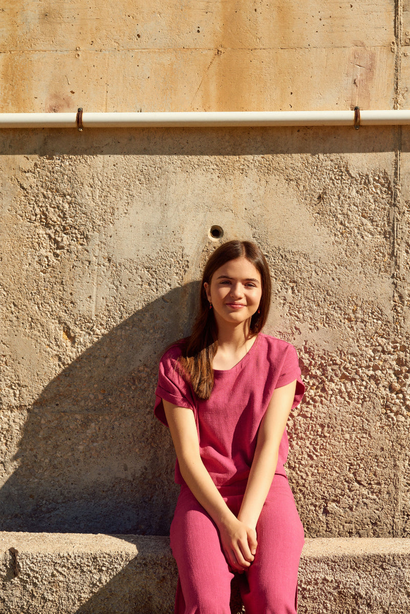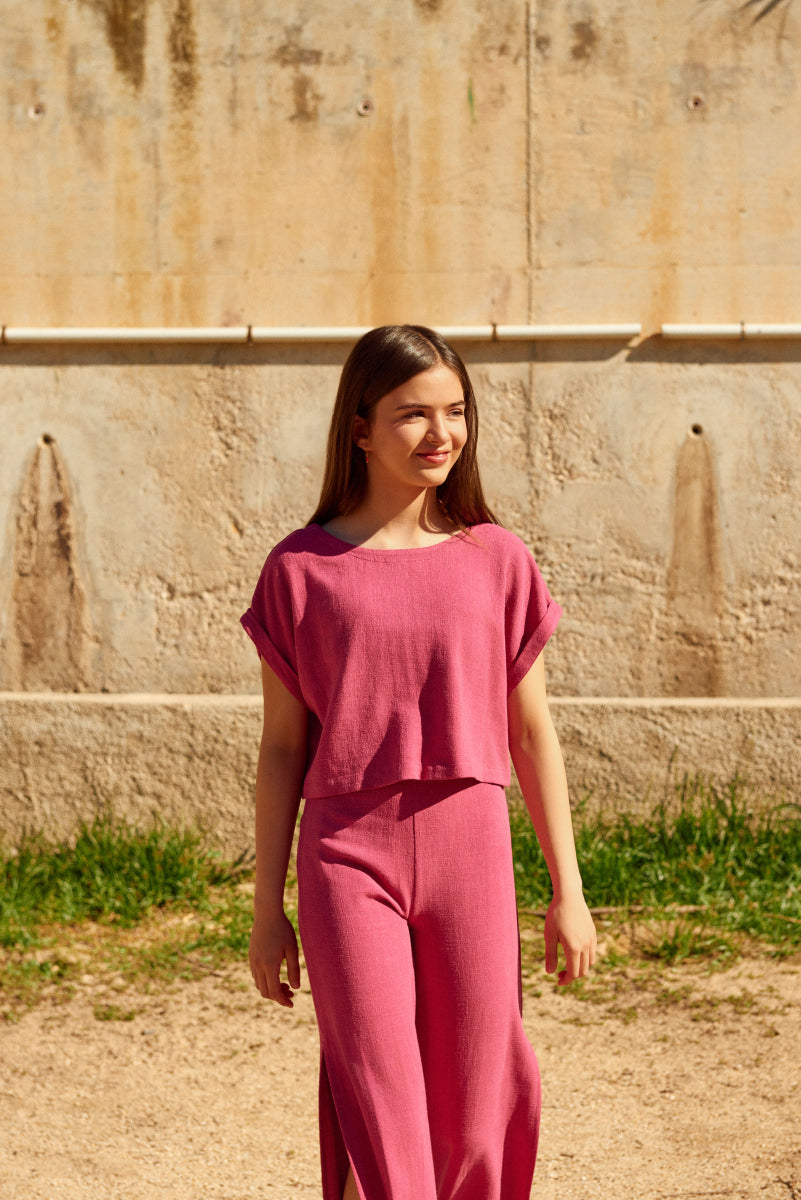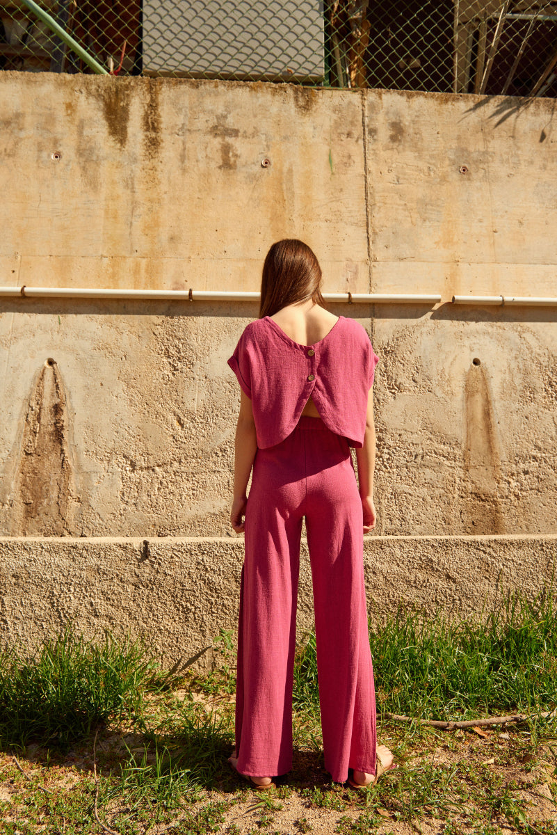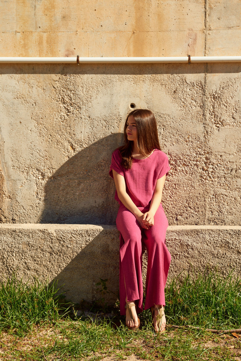 Tejido rústico suave 80% viscosa y 20% lino en un tono buganvilla muy favorecedor.