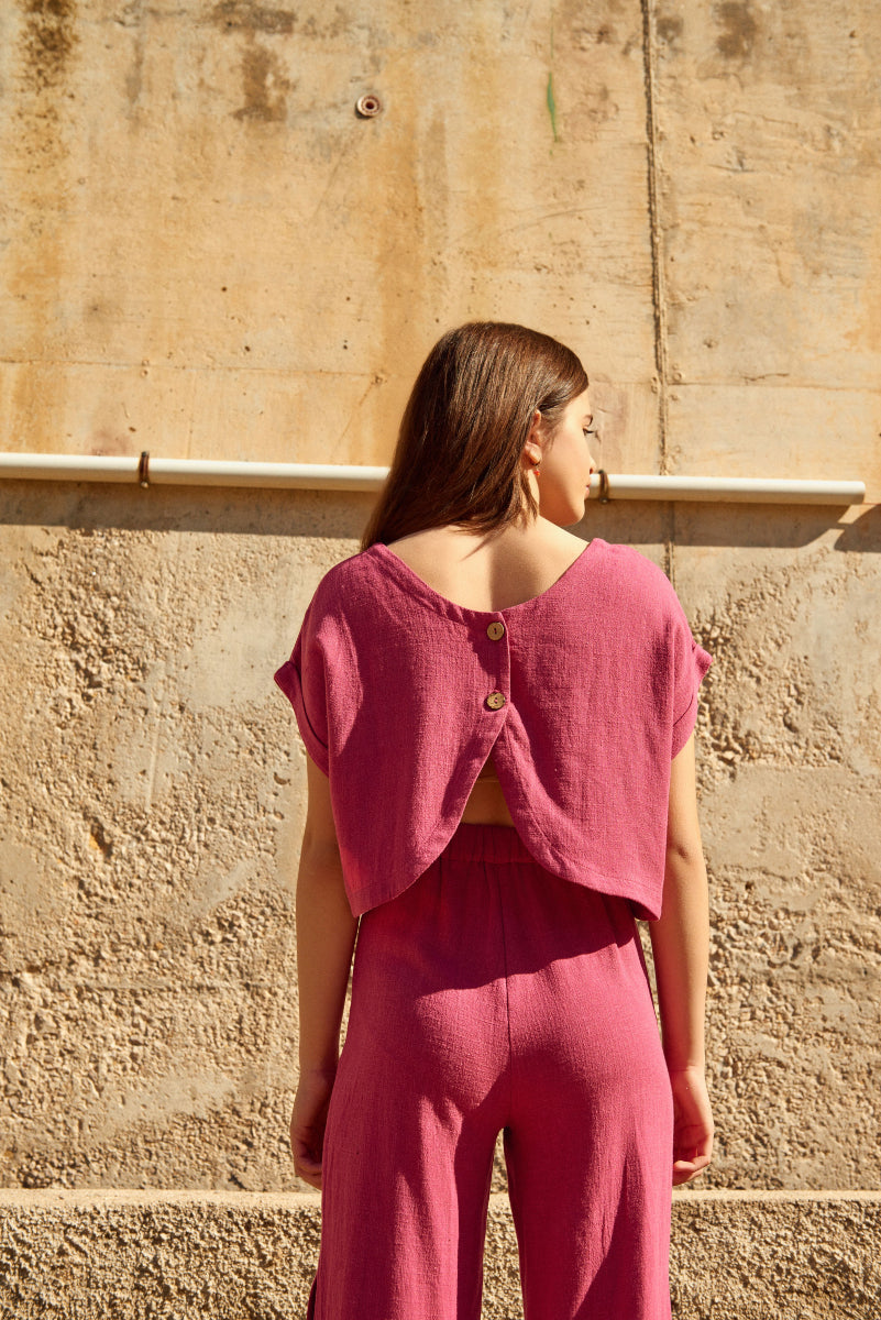Top ancho cropped, con escote redondeado trasero con botones de coco.