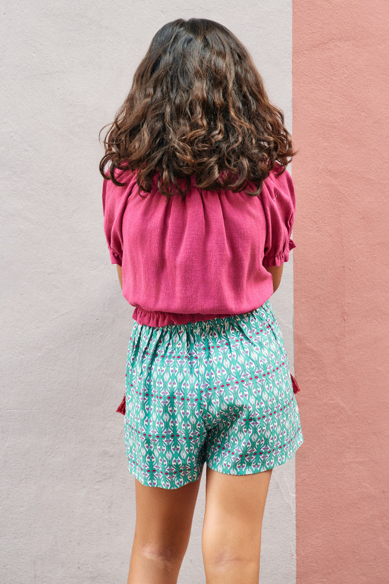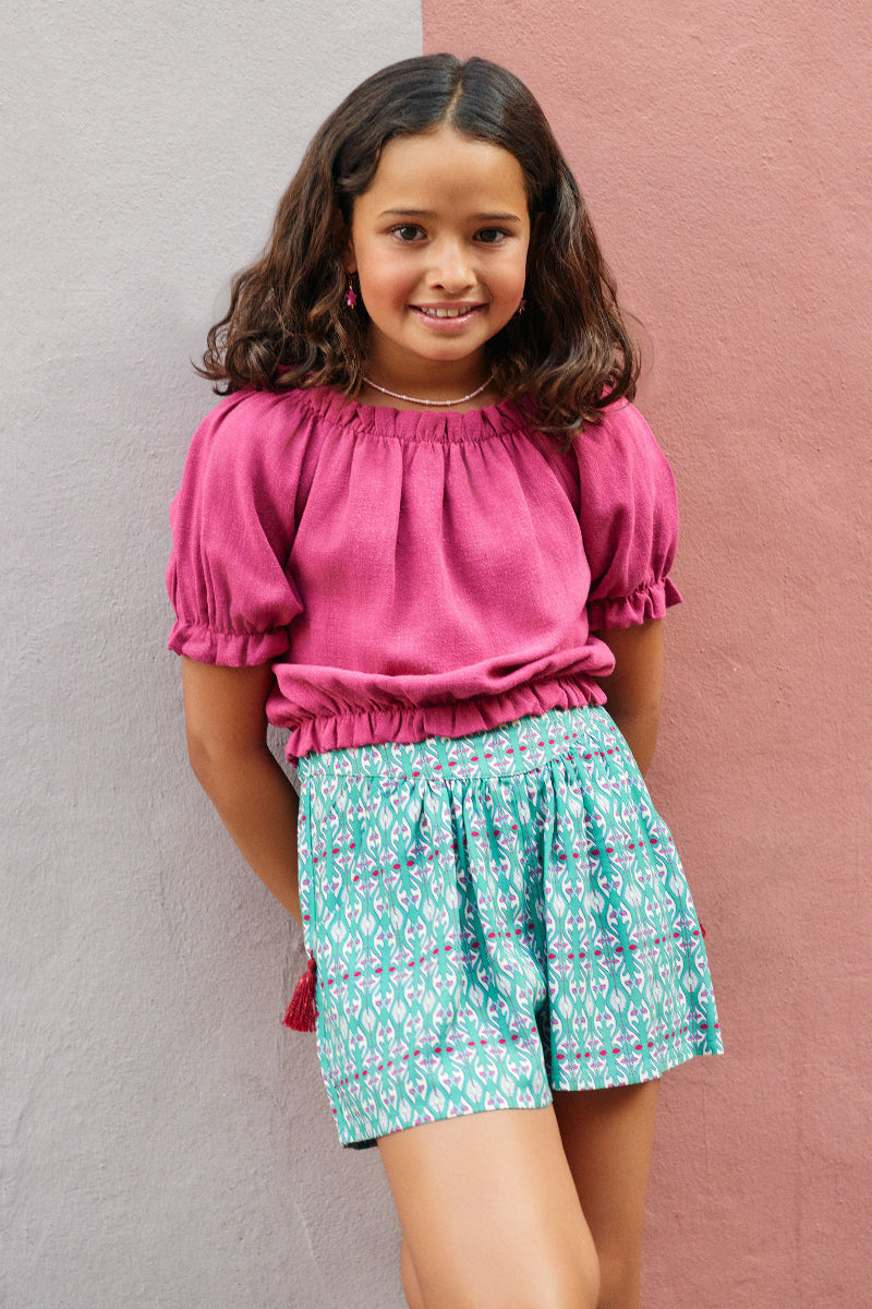 Una blusa sencilla muy TOP. Se pueden bajar las mangas y llevarla con los hombros descubiertos, ¡les encanta! A nosotros nos chifla con nuestro pantalón corto étnico verde.