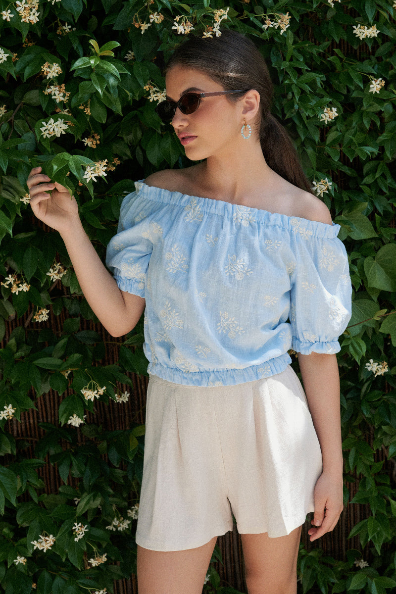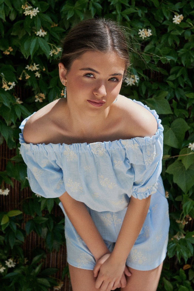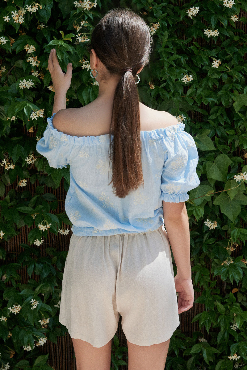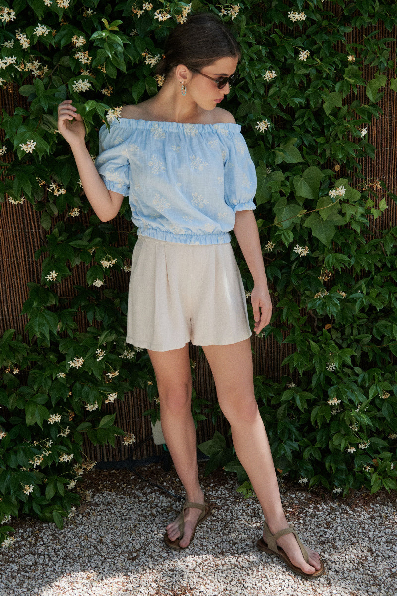 Se pueden bajar las mangas y llevarla con los hombros descubiertos. Combínala con el pantalón corto del mismo tejido, o con nuestro pantalón corto marfil, conseguirás un look muy sencillo y cómodo.