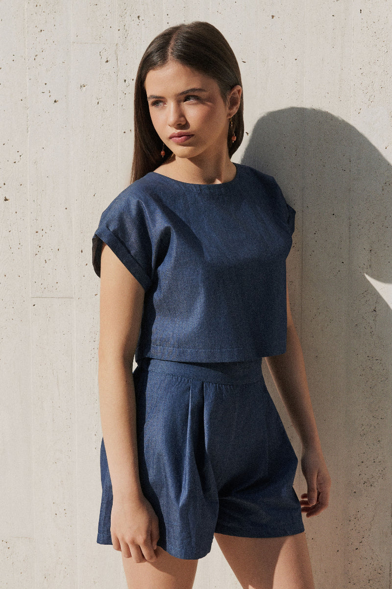 Top cropped cuello caja, escote en pico trasero. Cierre con botones coco en espalda.