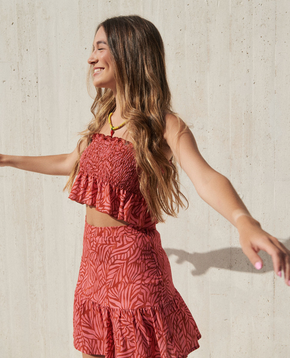 Top tipo bandeau con engomado y volante inferior.