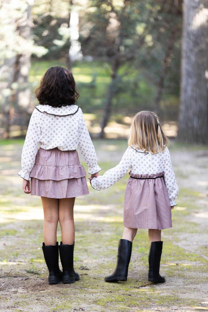 Cuello redondo con volante, corte alto en cintura. Manga larga con puño elástico acabada en volante. Cierre con botones en espalda. Detalle de cinta de terciopelo en cintura.