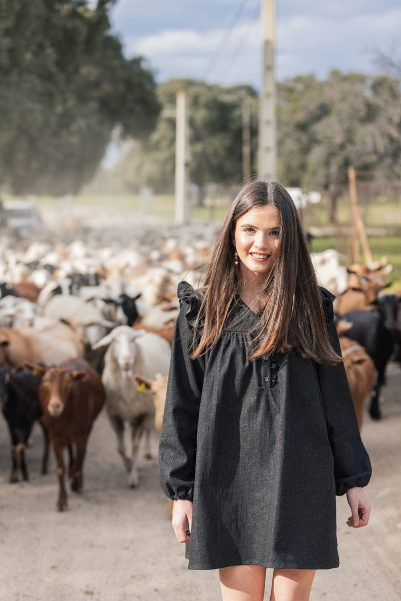 Tejido denim negro efecto lavado. Corte de vestido sencillo, fácil, ideal para niñas más mayorcitas. Combínalo con sus zapatillas preferidas o unas botas.