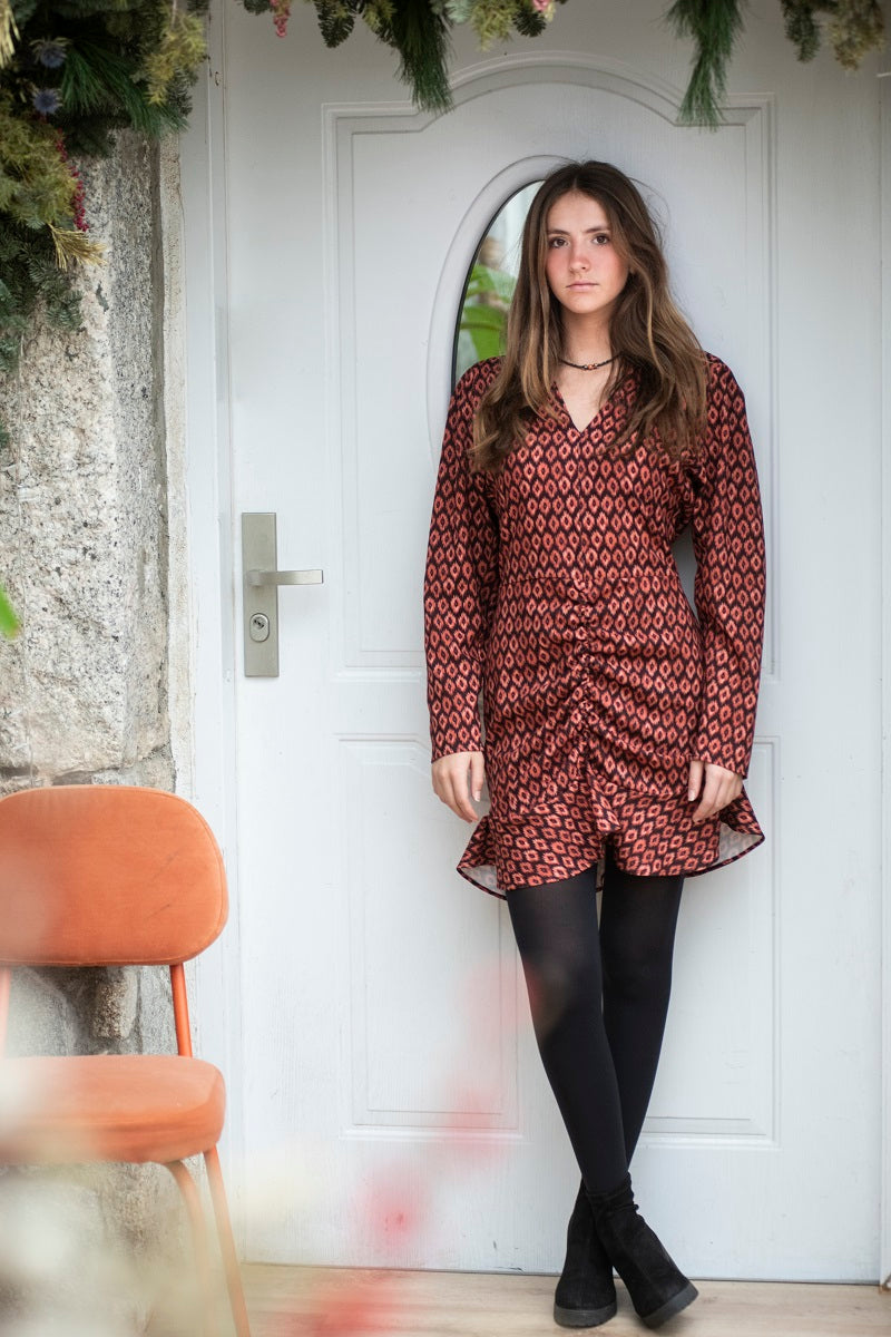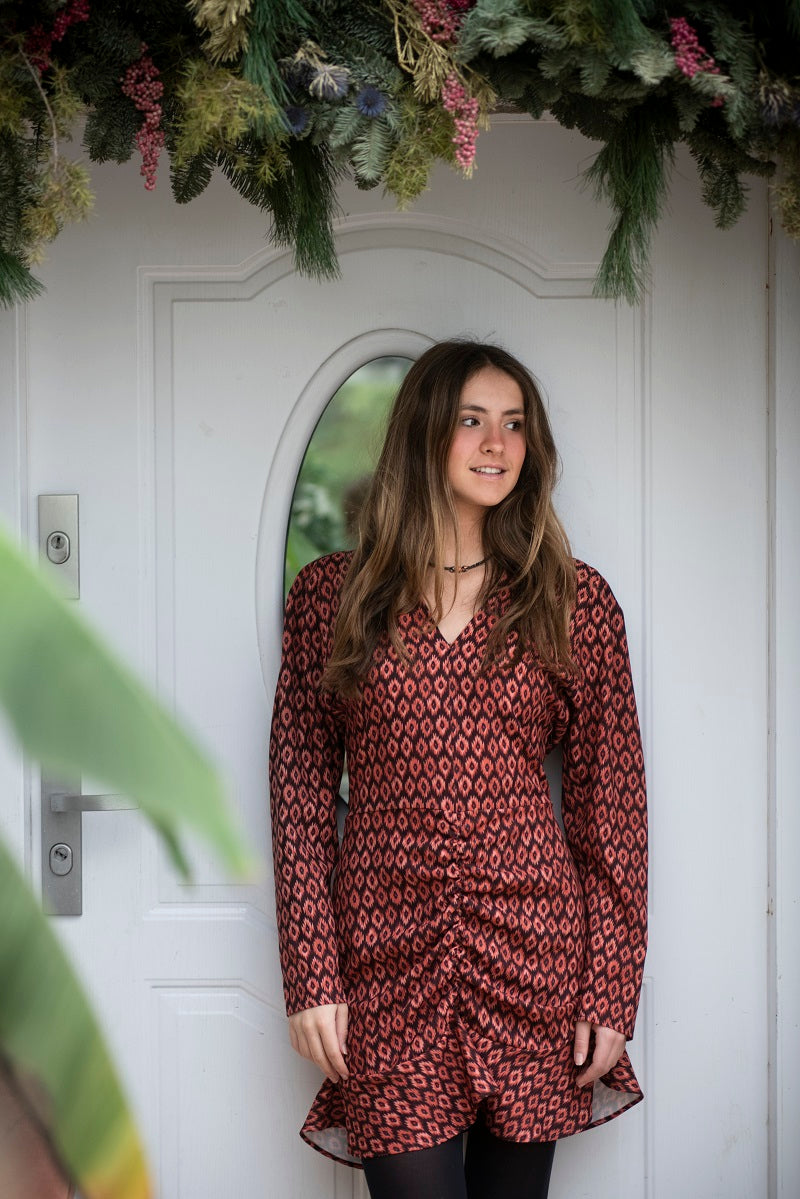 Vestido corto estampado cuello pico y corte en cintura. Manga larga. Falda fruncida entubada terminada con volante.