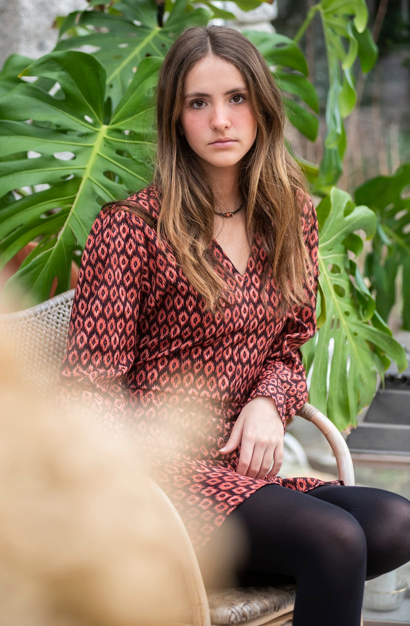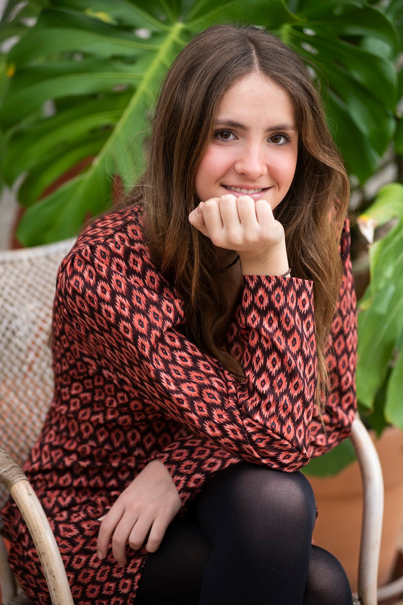 Estampado geométrico en tonos caldera, tostados y negros, ¡súper cañero y favorecedor!